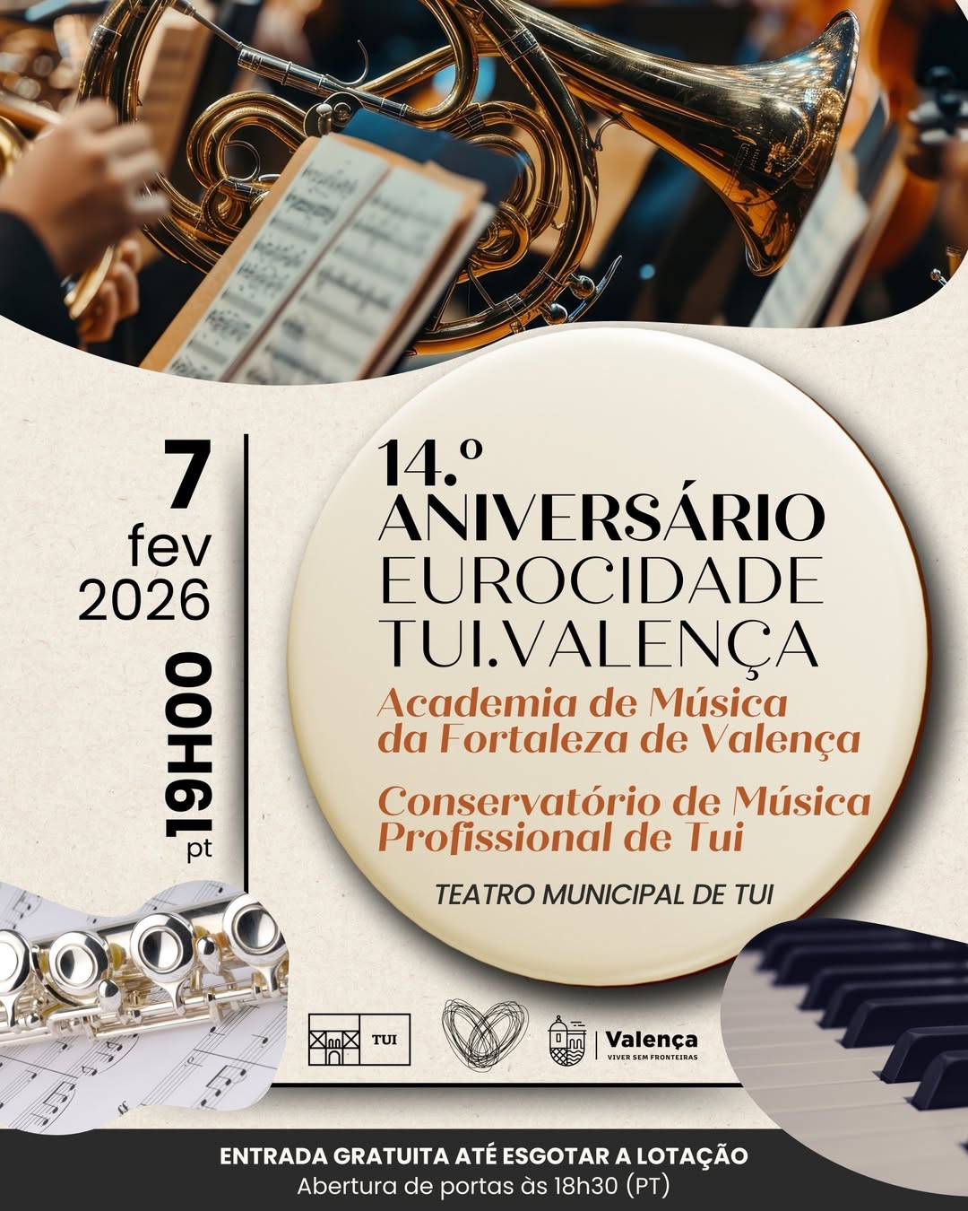 O Teatro Municipal de Tui será o cenário, no próximo sábado, 7 de fevereiro, às 19h00 (PT), de uma celebração muito especial: o Concerto do 14.º Aniversário da Eurocidade Tui–Valença.