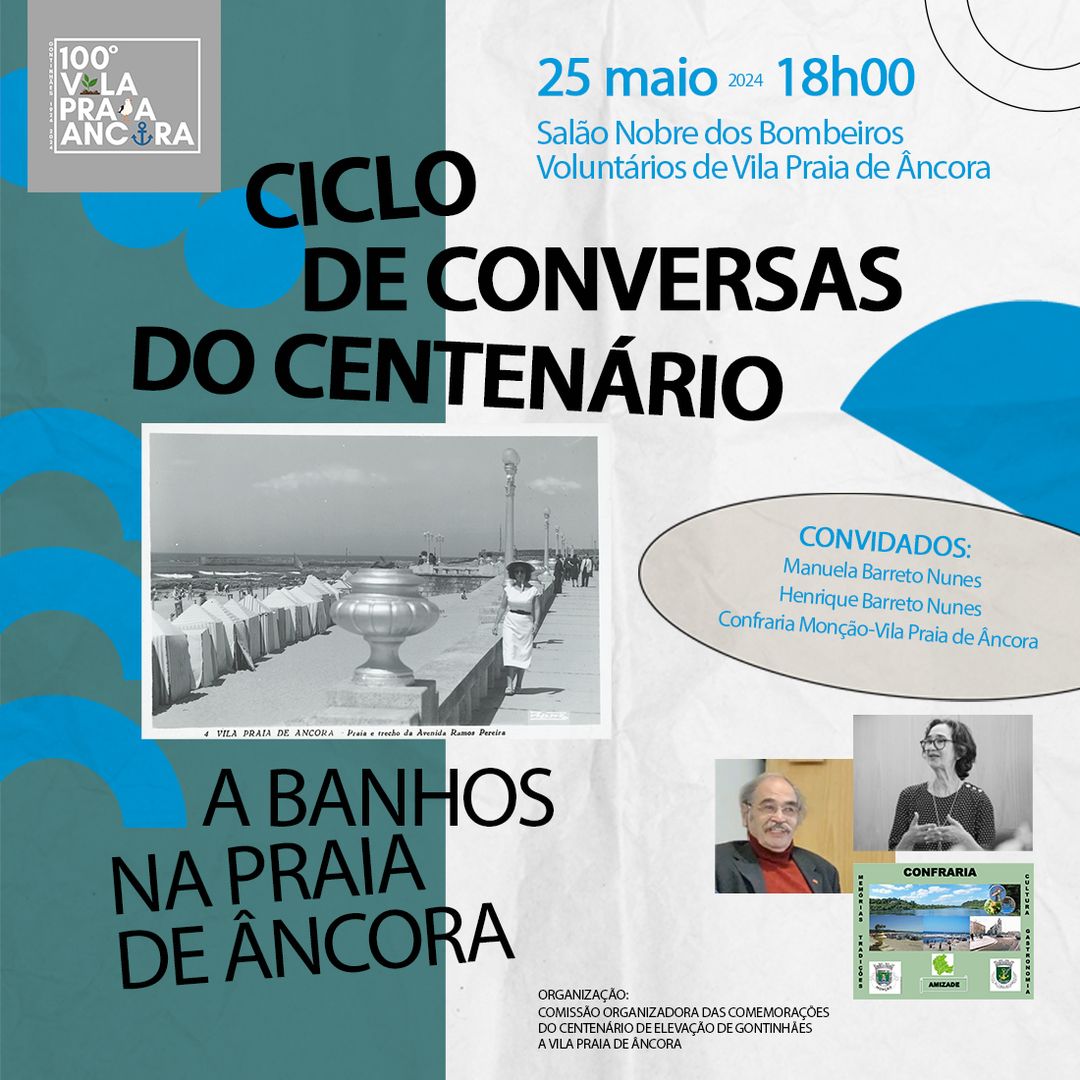 No dia 25 de maio, às 18 h00, no Salão Nobre dos Bombeiros Voluntários de Vila Praia de Âncora, vamos assistir à conversa numa perspetiva histórica sobre os banhos terapêuticos na praia de Âncora e as experiências pessoais e geracionais que ligam famílias e amigos de Monção a Vila Praia de Âncora.