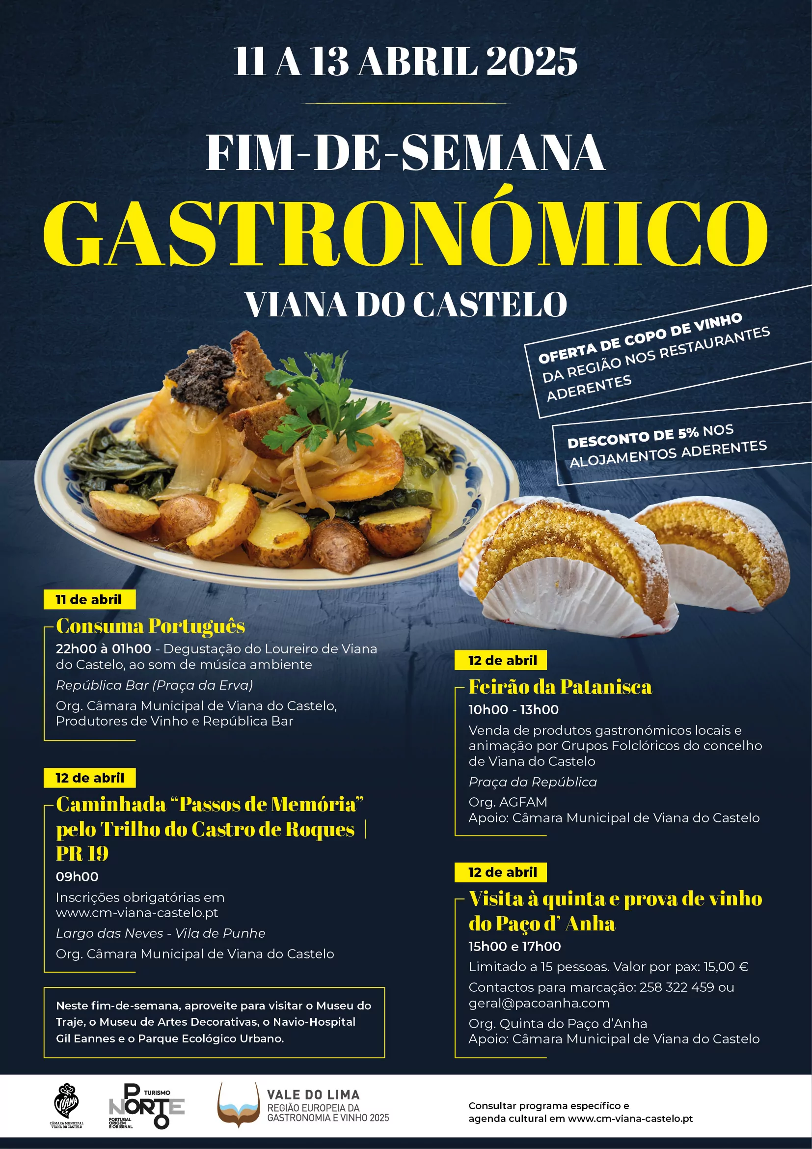 Entre os dias 11 e 13 de abril, a Câmara Municipal de Viana do Castelo, em colaboração com a Entidade Regional do Turismo do Porto e Norte de Portugal e em parceria com as empresas de restauração e alojamentos turísticos aderentes, promove o Fim-de-semana Gastronómico de Viana do Castelo, evento integrado no programa “Vale do Lima – Região Europeia da Gastronomia e Vinho 2025”.