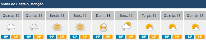 Numa previsão a 10 dias, o IPMA mostra já uma subida das temperaturas máximas acima dos 30ºC a partir do próximo dia 17 de julho, quarta-feira.