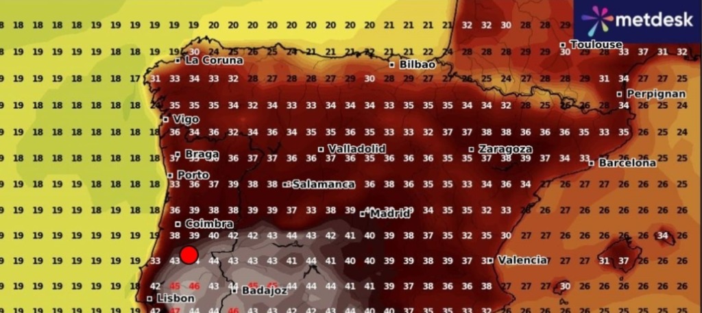 Segundo o portal meteorológico Meteo Certo, a partir do próximo dia 18 de julho “uma massa de ar quente vinda do norte de África vai começar a afetar o país, já com máximas entre os 30°C e 37°C, e até mesmo 43°C no Alentejo e Algarve, o litoral oeste de norte a sul, estará com máximas entre os 25°C e 33°C”.