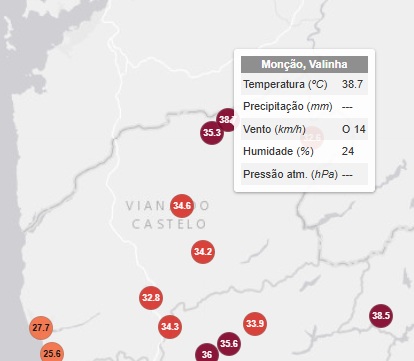 A temperatura mais alta registada hoje pelo Instituto Português do Mar e da Atmosfera (IPMA) no Alto Minho foi de 38,6ºC.