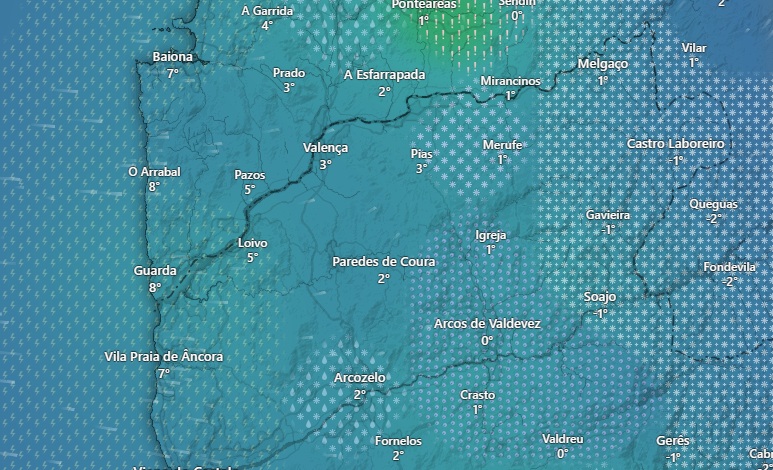 Está prevista “queda de neve acima de 600/800 metros, com acumulação da ordem de 20 a 30 cm acima dos 800 metros, podendo acumular até 5 cm acima de 600 metros de altitude, e baixando temporariamente a cota para 400 metros na noite de 23 para 24″.