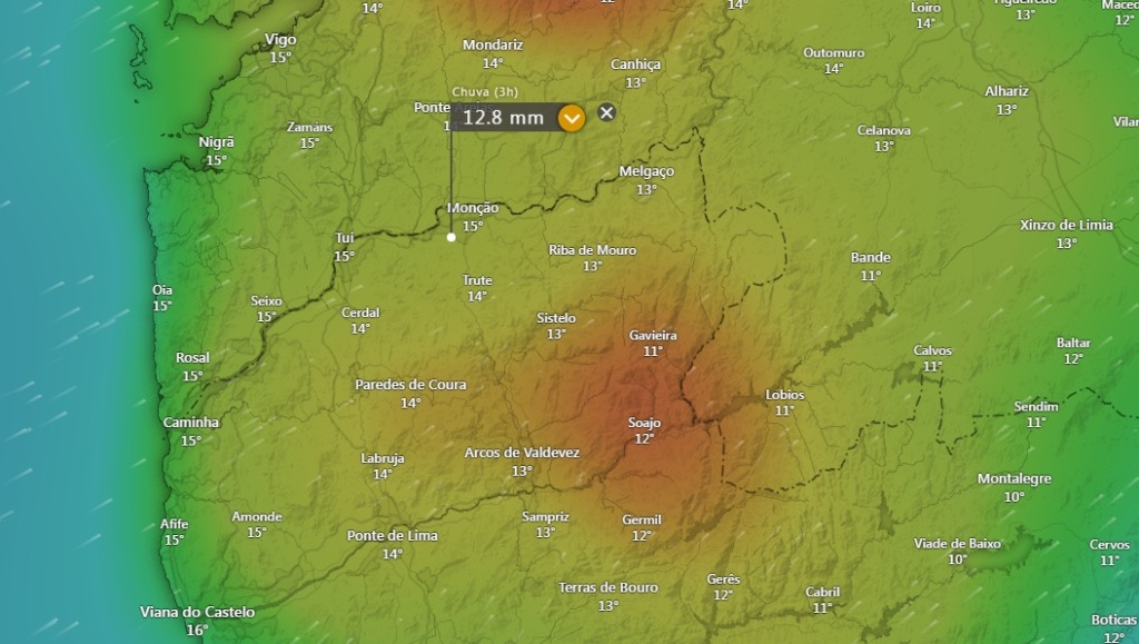 Durante a maior parte desta terça-feira, a chuva deverá ser fraca. No entanto, segundo o portal meteorológico windy.com, a chuva deverá tornar-se mais forte entre as 16h00 e as 20h00 no distrito de Viana do Castelo.