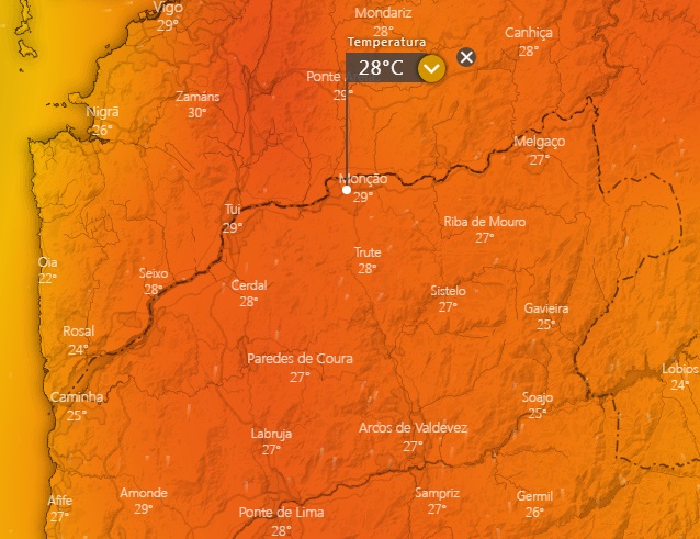 O Instituto Português do Mar e da Atmosfera (IPMA) prevê também que a barreira dos 30ºC seja ultrapassada em Monção na próxima semana. Mais ao lado, em Melgaço, os termómetros deverão chegar aos 30ºC.
