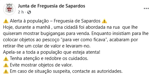 Em nota divulgada, aquele orgão autárquico apela à população para estar atenta. “Tenha atenção e redobre os cuidados. Evite mostrar objetos de valor”, recomenda.