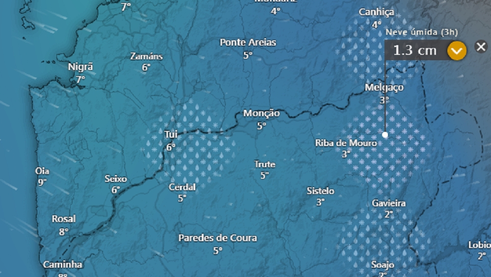Também o portal windy.com aponta, para a mesma data, baixas temperaturas em todo o Alto Minho, com possibilidade de neve húmida (aguaneve) não só em Melgaço e Arcos de Valdevez, como nos locais mais elevados de Valença.