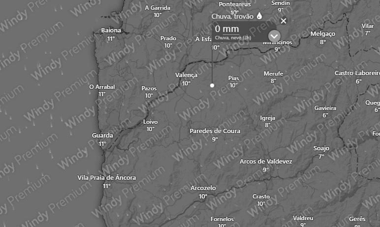 O portal meteorológico Windy confirma também ausência total de precipitação nestes dias em todo o Alto Minho.