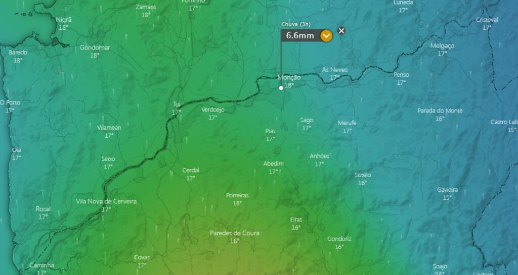 Por sua vez, o portal windy.com prevê precipitação mais intensa no Vale do Minho durante a manha de quarta-feira. Antes disso, possibilidade de trovoada na região na terça-feira ao início da tarde.