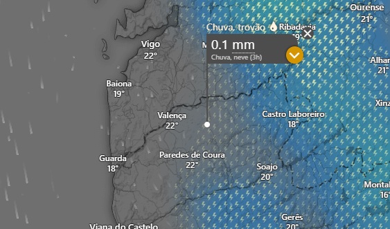 Avizinha-se trovoada, prevista pelo IPMA para segunda e terça-feira. No entanto, o portal Windy prevê que possa chegar ao Alto Minho já no domingo com a precipitação prevista para o final da tarde.