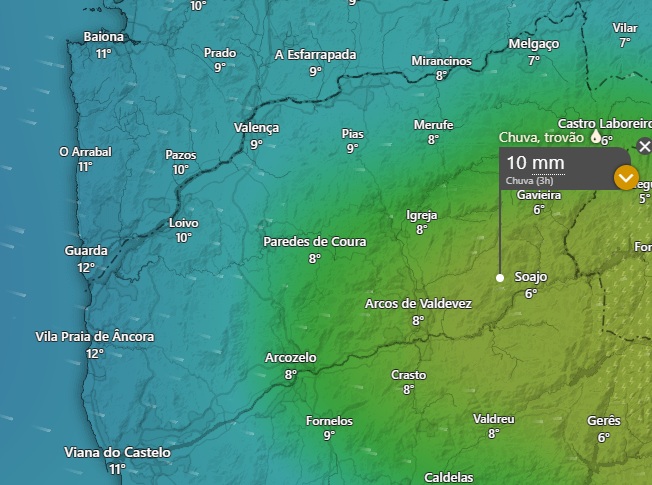 De acordo com o portal Windy, a madrugada vai ser de chuva mas será entre as 5h00 e as 8h00 que deverá registar-se o período de precipitação mais intensa.