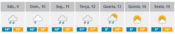 Chuva fraca, na maior parte dos dias. Vai ser mais intensa ao final da madrugada e princípio da manhã da próxima terça-feira, segundo o portal meteorológico windy.com.