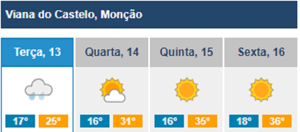 No caso de Monção, o Instituto Português do Mar e da Atmosfera (IPMA), prevê 25ºC de máxima para esta terça-feira. No entanto, na próxima sexta-feira, os termómetros deverão alcançar os 36ºC.