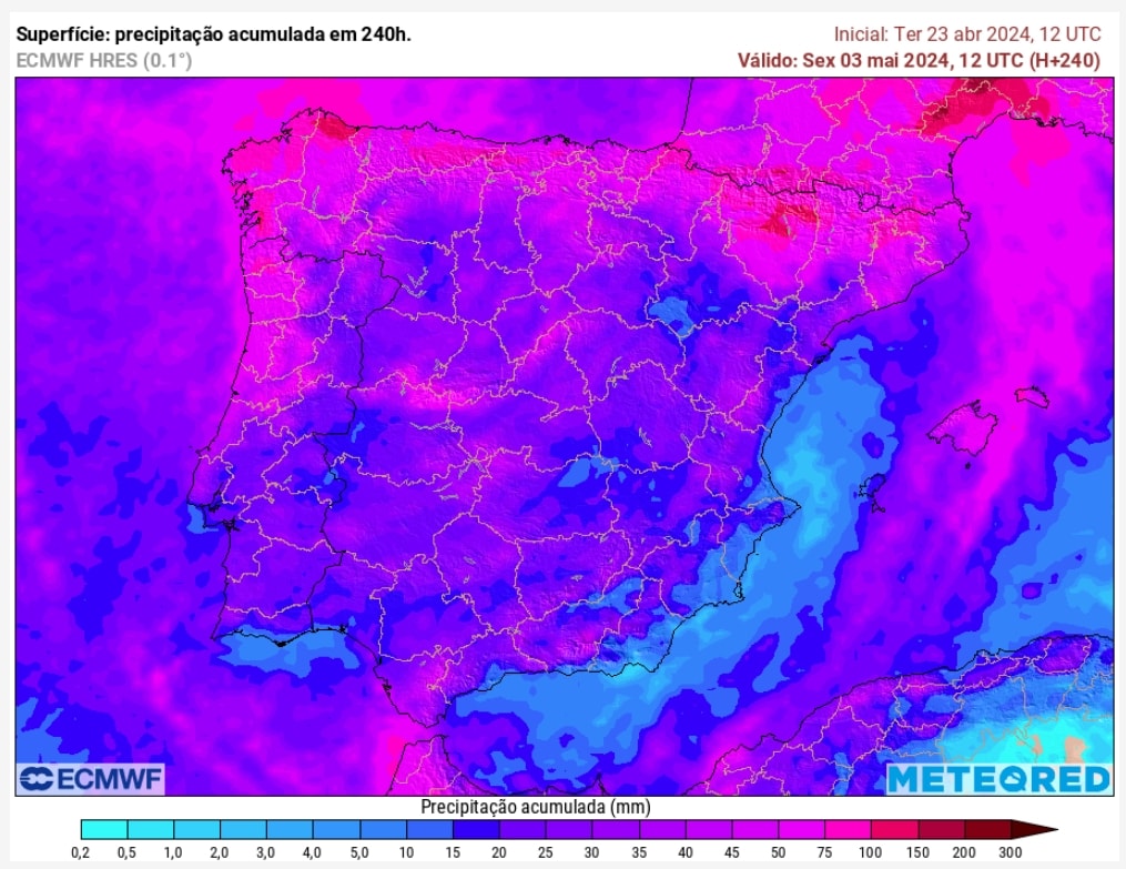 Esta terça-feira, o portal Meteo Trás os Montes – Portugal, divulgou um mapa meteorológico de precipitação acumulada na Península Ibérica até ao próximo dia 3 de maio.