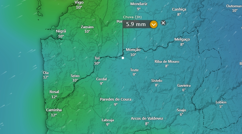 O portal meteorológico windy.com aponta período de chuva mais forte para o final da tarde de sexta-feira.