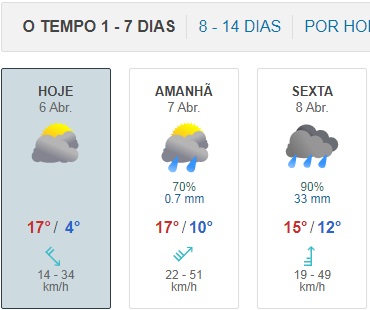 As temperaturas máximas vão registar uma ligeira descida dos 17ºC para os 15ºC. As mínimas vão subir até aos 12ºC.