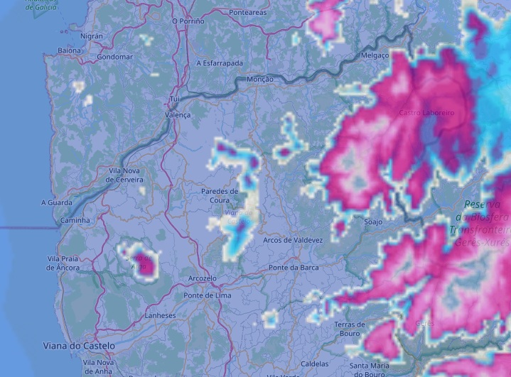 A imagem mostra até maiores acumulações [manchas rosa] em Valença, nas zonas mais elevadas de Taião.