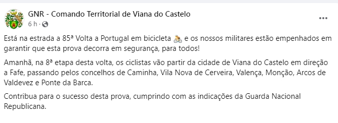 “Está na estrada a 85ª Volta a Portugal em bicicleta e os nossos militares estão empenhados em garantir que esta prova decorra em segurança, para todos! Amanhã [hoje], na 8ª etapa desta volta, os ciclistas vão partir da cidade de Viana do Castelo em direção a Fafe, passando pelos concelhos de Caminha, Vila Nova de Cerveira, Valença, Monção, Arcos de Valdevez e Ponte da Barca. Contribua para o sucesso desta prova, cumprindo com as indicações da Guarda Nacional Republicana”, apela a autoridade.