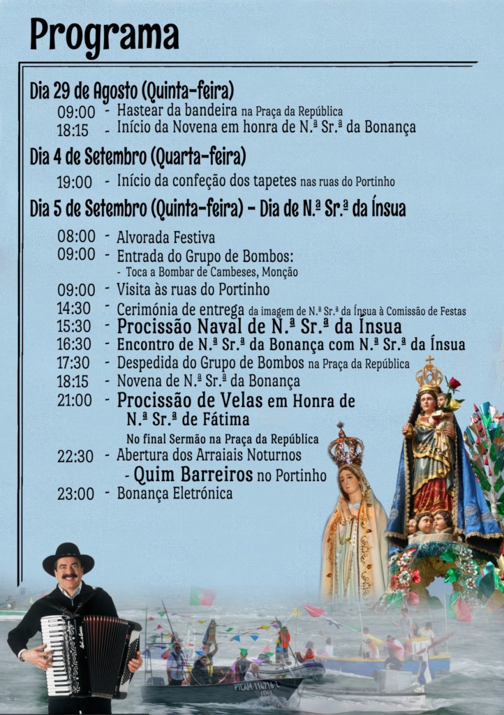 Para dia 5 de setembro, entre outras iniciativas, está marcada para as 15h30 a Procissão Naval de Nª Srª da Ínsua. Mais à noite, a partir das 22h30, atua Quim Barreiros.