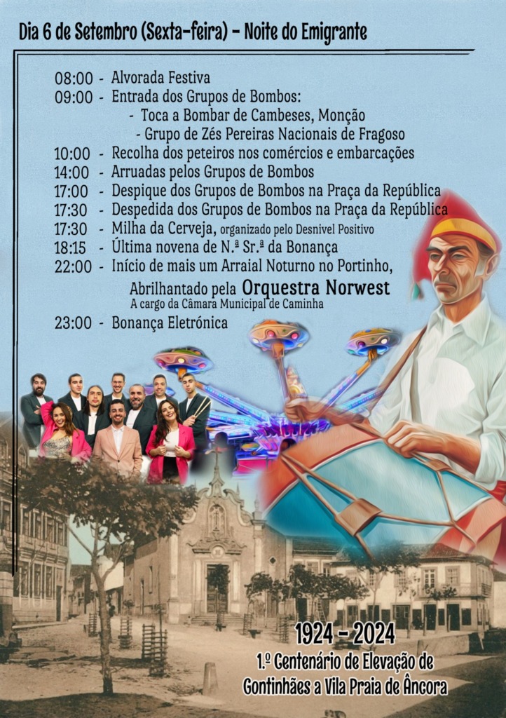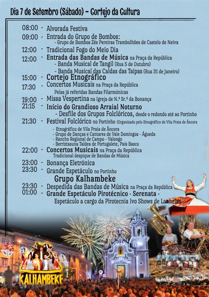 Para o dia 7 de setembro, sábado, está marcado o cortejo etnográfico. Haverá ainda o Festival Folclórico e mais à noite, pelas 23h30, atua o grupo Kalhambeke. Logo a seguir um espetáculo de fogo-de-artifício.