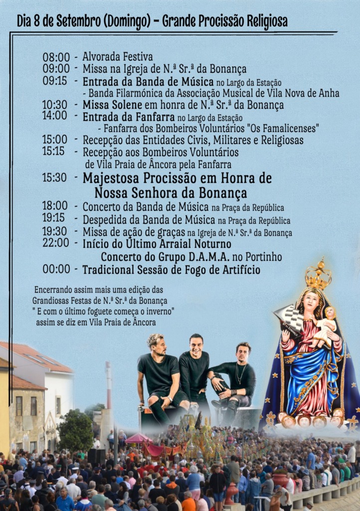 Para o último dia, domingo, está prevista a Majestosa Procissão em Honra de Nª Srª da Bonança, às 15h30. Pelas 22h00 atuam os D.A.M.A com nova sessão de fogo-de-artifício a encerrar as festas.