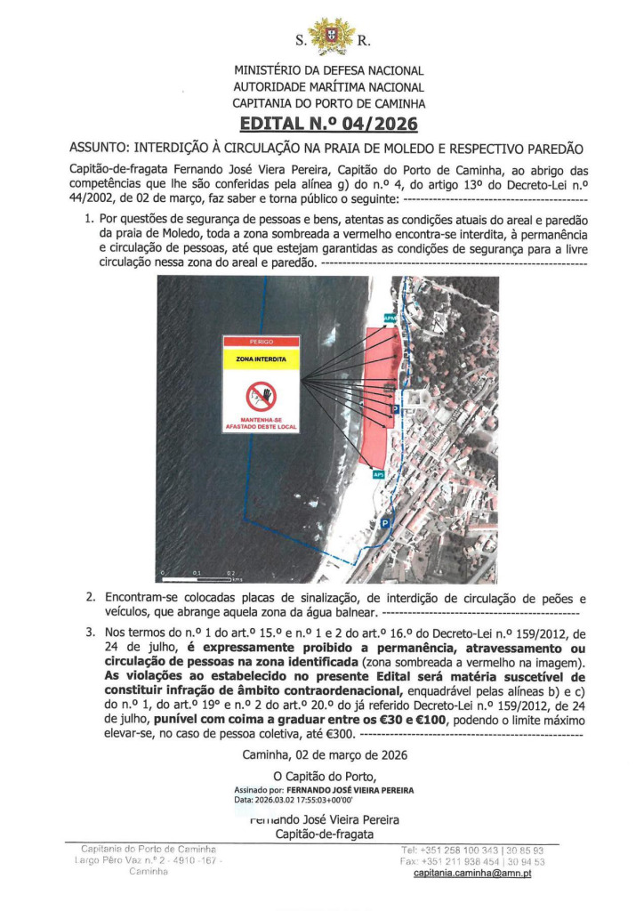 Está, a partir de hoje, interdita a circulação na praia e no paredão de Moledo. A proibição está expressa num edital publicado pela Capitania do Porto de Caminha.