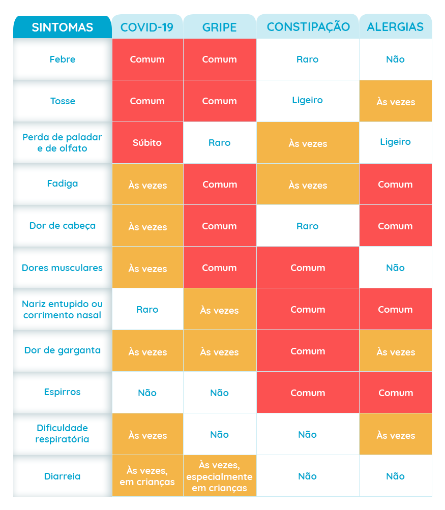 Por outro lado, a ocorrência de febre é rara, por exemplo, nas constipações ou alergias. Apesar de algumas das pessoas infetadas com COVID-19 serem assintomáticas, é importante avaliar os sintomas como um todo para conseguir perceber a sua causa.