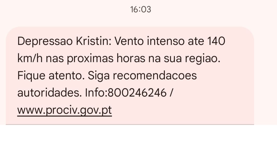 A Autoridade Nacional de Emergência e Proteção Civil (ANEPC) enviou esta terça-feira uma SMS a alertar a população para o vento forte que virá com a tempestade Kristin.