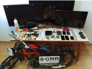Foram também apreendidas duas armas brancas; três balanças de precisão; cinco telemóveis; três televisores; dois anéis de ouro; em motociclo.
