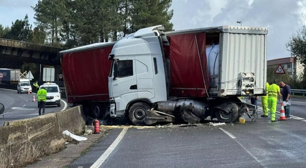 Um aparatoso despiste de camião condicionou o trânsito ao final da manhã desta sexta-feira na A-55 na zona de Guillarei, em Tui, na Galiza.