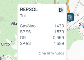 De acordo com o portal Via Michelin, a Repsol de Tui está hoje a vender o gasóleo a 1,439 euros por litro e a gasolina 95 a 1,539 euros por litro.