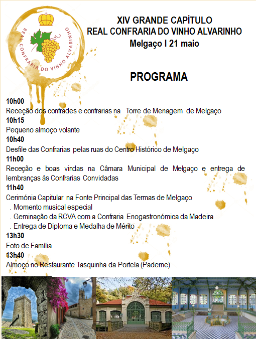 A Real Confraria do Vinho Alvarinho (RCVA) realiza no próximo sábado, em Melgaço, o XIV Grande Capítulo. Trata-se da cerimónia de entronização de novos confrades que vão passar a integrar esta Confraria fundada em 2007.