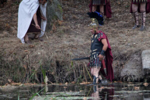 O general romano, sem ponta de medo, decidiu atravessar. Tomou nas mãos o estandarte da legião. Cruzou o rio. A partir da outra margem chamou os soldados um por um – pelo nome – para convencê-los de que não se tinha esquecido de nada e podiam atravessar para continuar a campanha militar.