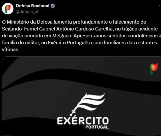 “O Ministério da Defesa lamenta profundamente o falecimento do Segundo-Furriel Gabriel António Cardoso Garelha, no trágico acidente de viação ocorrido em Melgaço. Apresentamos sentidas condolências à família do militar, ao Exército Português e aos familiares das restantes vítimas”, pode ler-se numa nota no ministério.