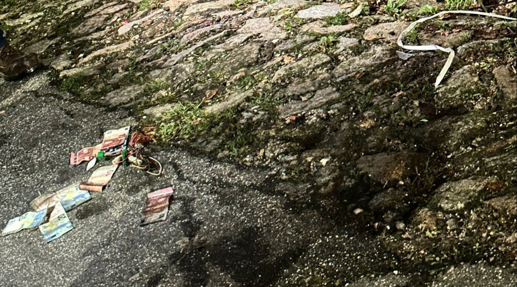 Para trás ficou o material utilizado para provocar a explosão e várias notas espalhadas.