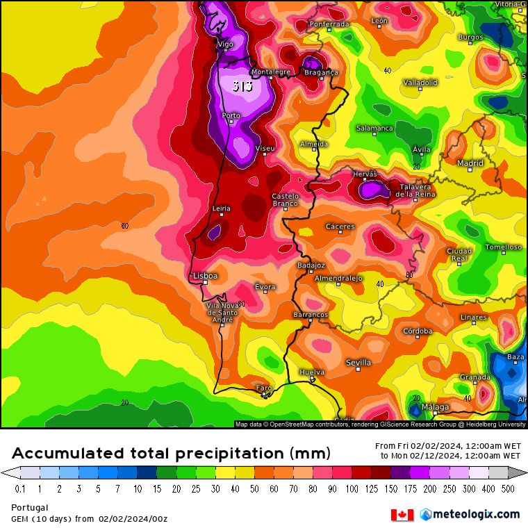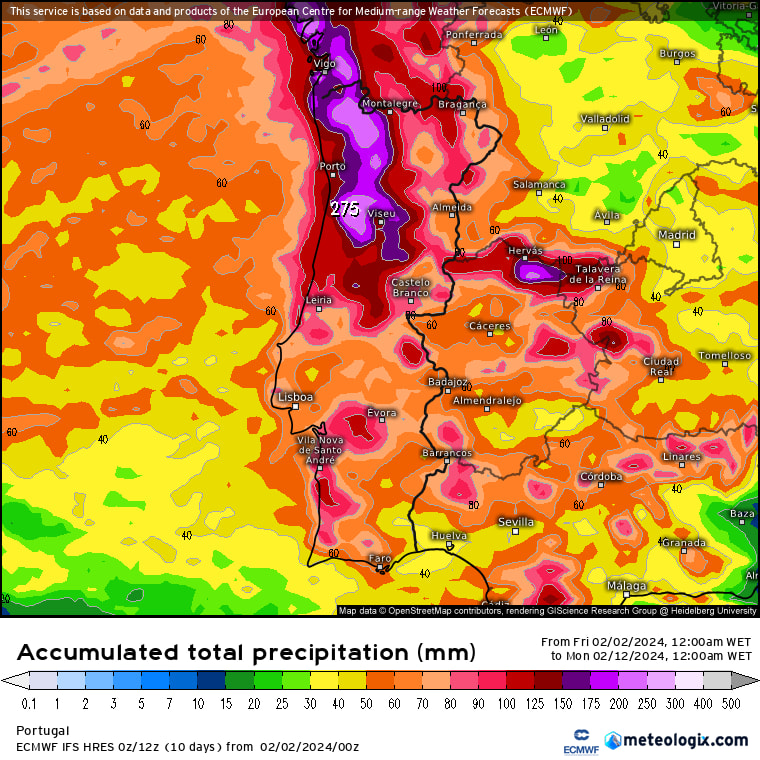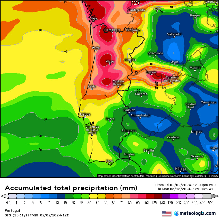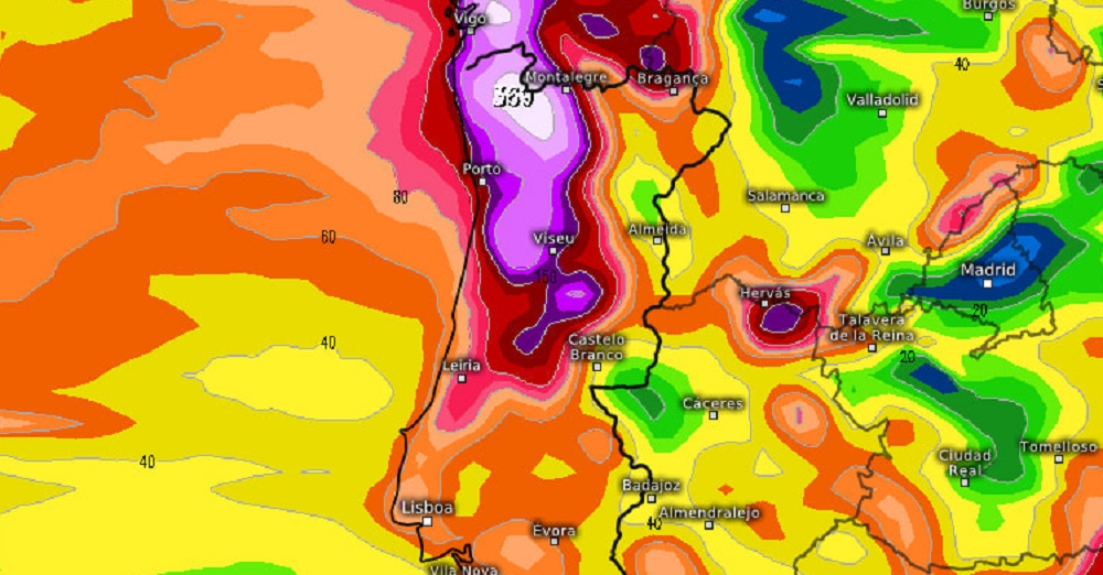O modelo europeu é menos generoso, mas prevê também abundância de precipitação nos próximos dias: 27,5 litros por metro quadrado no Alto Minho.