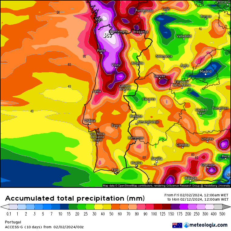 O modelo australiano é aquele que mais precipitação prevê para o Alto Minho. Aponta uma acumulação de 36,9 litros de chuva por metro quadrado nos próximos 10 dias.