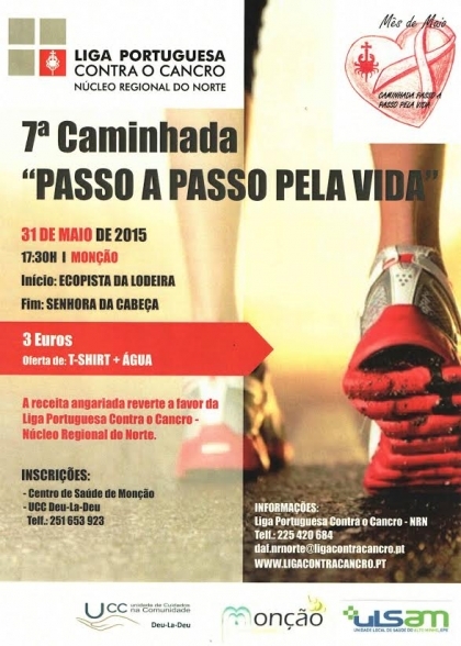 O Centro de Saúde de Monção realiza este domingo a VII Caminhada na Luta contra o Cancro. A saída está marcada para as 17h30, da Ecopista do Rio Minho. O ponto de chegada será na Senhora da Cabeça, em Cortes.