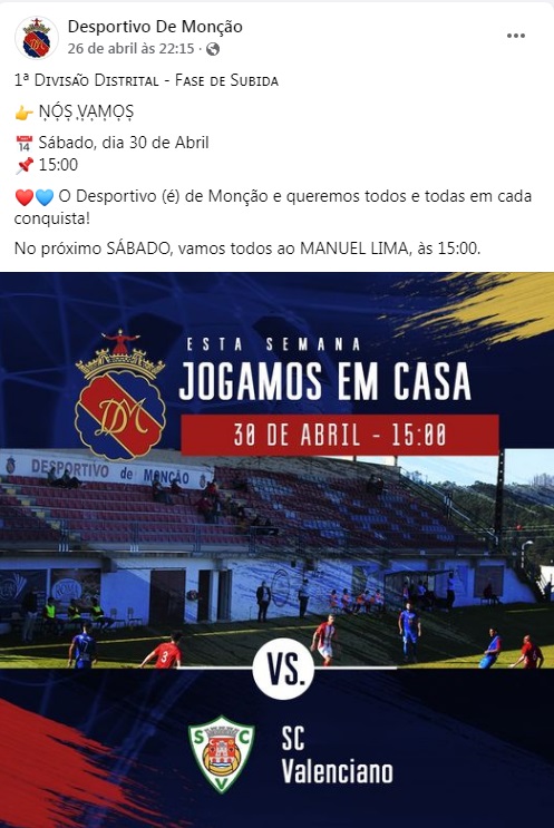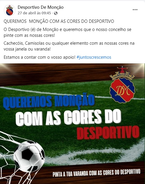 “O Desportivo (é) de Monção e queremos que o nosso concelho se pinte com as nossas cores! Cachecóis, Camisolas ou qualquer elemento com as nossas cores na vossa janela ou varanda!”, lê-se numa das publicações do clube.