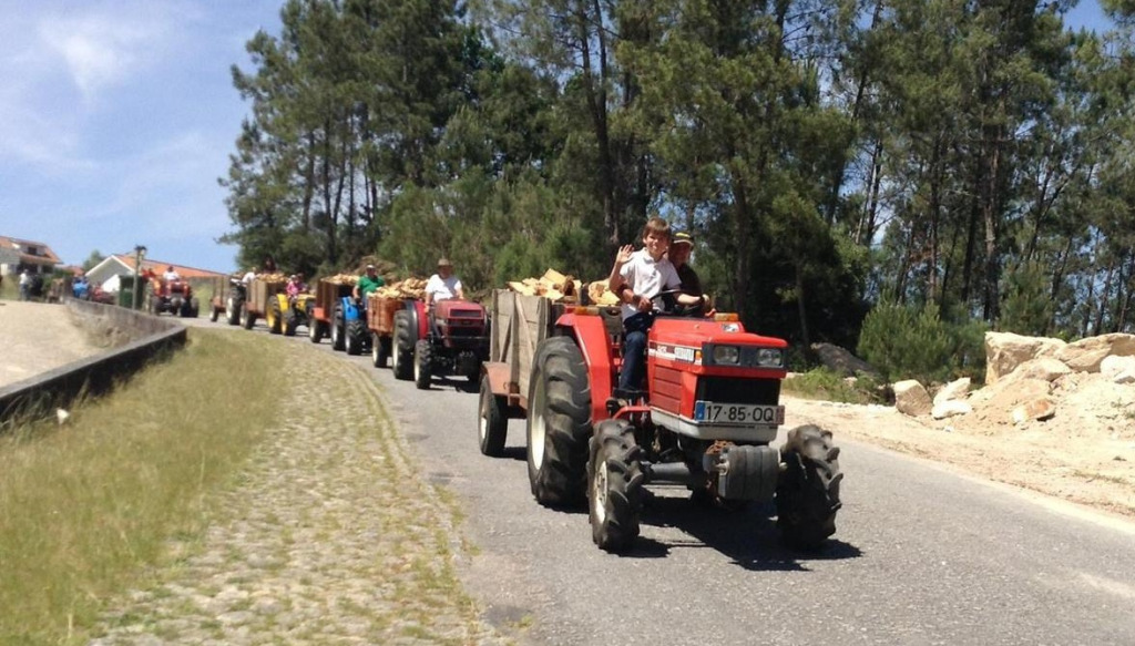 Prontos a passar pelos olhos do público estão já cerca de 30 tratores carregados de lenha de pinheiro. A carga vai ser leiloada por lotes.