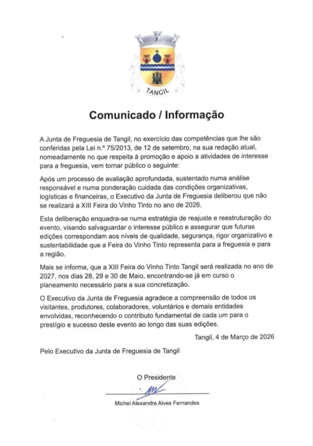 Em comunicado, lê-se que “após um processo de avaliação profundada, sustentado numa análise responsável e numa ponderação cuidada das condições organizativas, logísticas e financeiras, o Executivo da Junta de Freguesia deliberou que não se realzará a XIII Feira do Vinho Tinto no ano de 2026″.