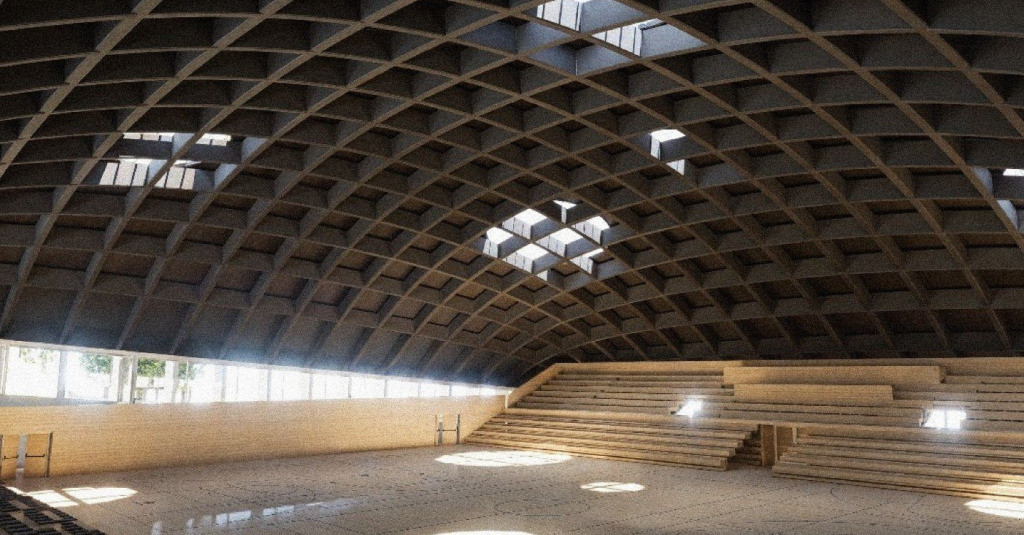 “Terá uma bancada retrátil, proporcionando assim mais espaço para treino. A ventilação será natural” e, no teto em forma de abóbada, existirão aberturas circulares que vão fornecer também iluminação natural a todo o espaço.