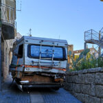 O inevitável aconteceu. Demasiado longo, o veículo depressa entrou em dificuldades para prosseguir. Entre manobras para a frente e puxa-atrás, as amolgadelas começaram a acontecer. Foi de mal a pior. A excessiva altura do veículo acabou também por danificar a varanda de uma residência naquele local. O aparato começava a aumentar e a juntar populares.