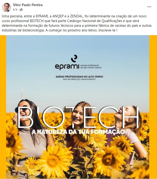 “Uma parceria, entre a EPRAMI, a ANQEP [Agência Nacional para a Qualificação e o Ensino Profissional] e a ZENDAL, foi determinante na criação de um novo curso profissional BIOTECH que fará parte Catálogo Nacional de Qualificações e que será determinante na formação de futuros técnicos para a primeira fábrica de vacinas do país e outras indústrias de biotecnologia. A começar no próximo ano letivo”, referiu o presidente da Câmara de Paredes de Coura, Vítor Paulo Pereira.