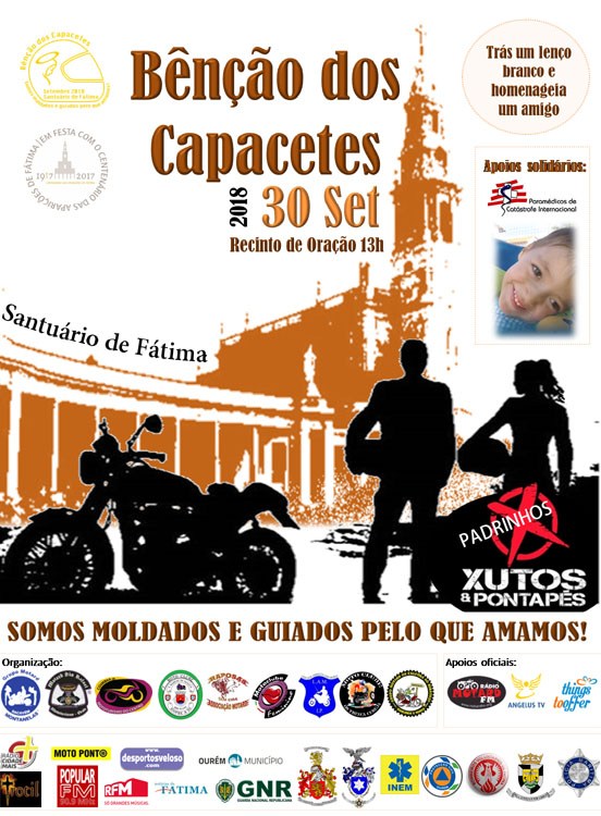 Cerca de 15 motociclistas de Paredes de Coura saíram este sábado daquela vila alto-minhota para participarem na cerimónia da Bênção dos Capacetes, a ter lugar este domingo no Santuário de Fátima. Surgido em 2014, este ritual religioso “nasceu através da boa vontade de muitos motociclistas”, refere a organização que elegeu este ano como padrinhos a banda Xutos & Pontapés. “Esta bênção foi criada sem quaisquer fins lucrativos, com o objectivo de promover o convívio cultural e recreativo entre amigos, detentores e utilizadores de motociclos sejam de grande ou pequena cilindrada”, acrescenta.