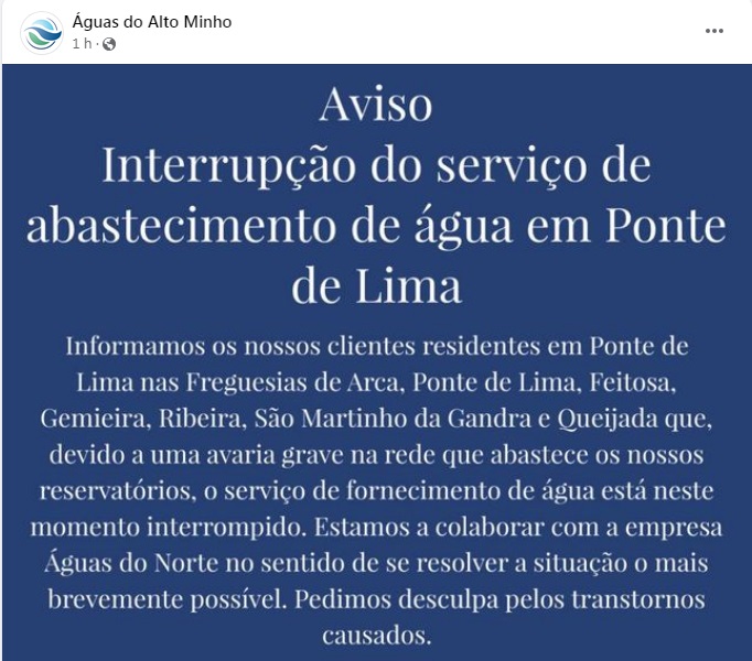 Comunicado divulgado pela Águas do Alto Minho nas redes sociais