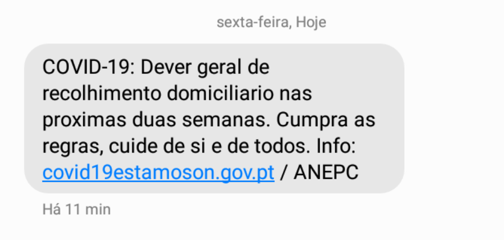 No primeiro dia do confinamento geral em todo o país, a Proteção Civil está a enviar uma SMS onde alerta para o “dever geral de recolhimento domiciliário nas próximas duas semanas”, altura em que o Governo irá rever as medidas aplicadas.