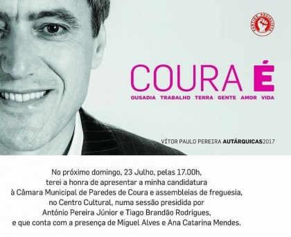 O Ministro da Educação, Tiago Brandão Rodrigues, vai marcar presença na apresentação pública de Vítor Paulo Pereira como candidato pelo PS à Câmara Municipal de Paredes de Coura nas próximas eleições autárquicas. A cerimónia está agendada para 23 de julho. O anúncio foi feito esta sexta-feira, nas redes sociais, num cartaz onde o atual presidente de Câmara usa como lema de campanha «Coura É… ousadia… trabalho… terra… gente… amor… vida».
