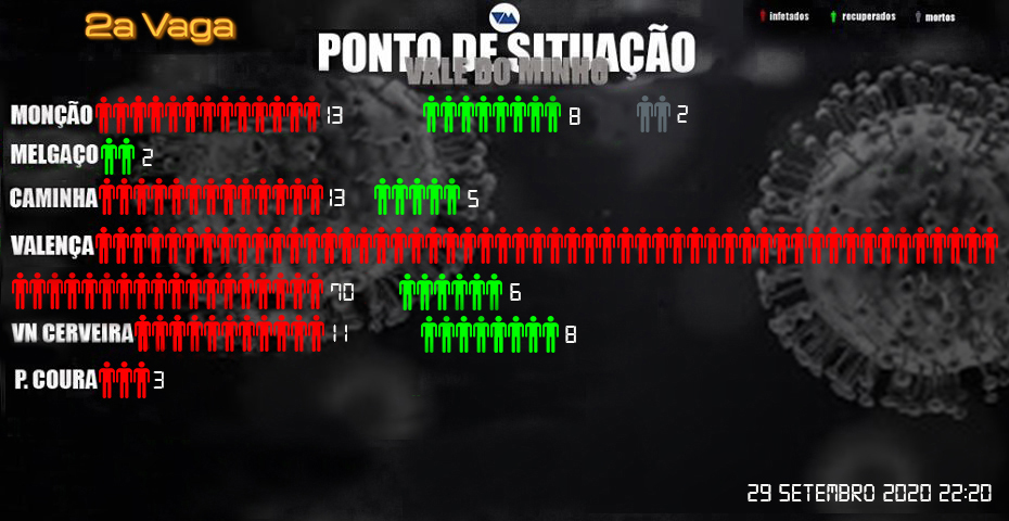 Começamos novamente por Valença, que teve um dia menos triste. Este concelho somou mais três casos de infeção pela nova doença, mas registou mais seis recuperados. Continua como o mais afetado nesta 2ª vaga. Em números, o concelho apresenta agora 97 casos confirmados, dos quais 70 estão ativos e 27 recuperados.