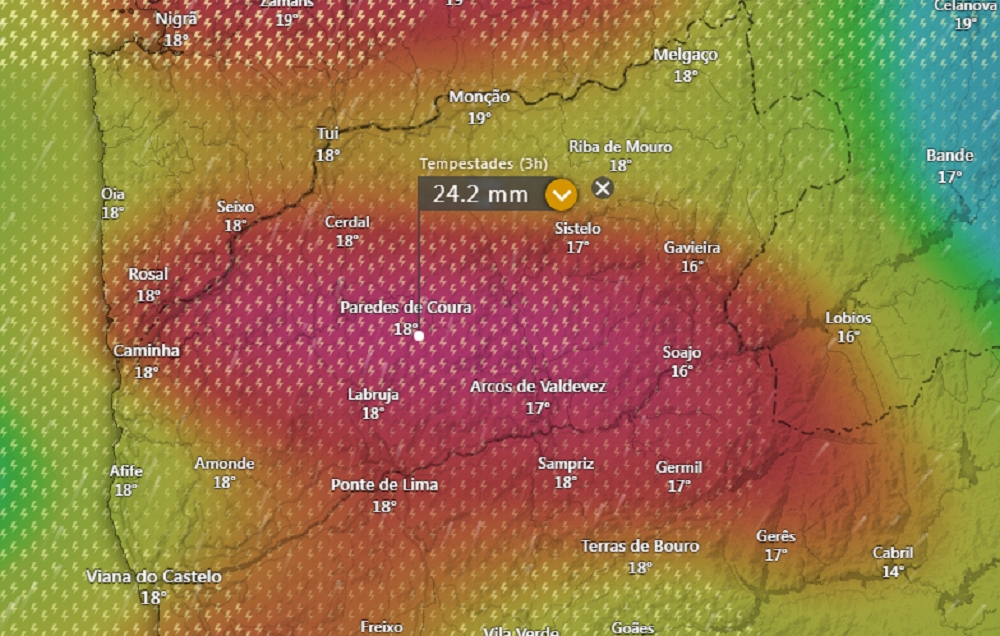 O momento de precipitação mais intensa deverá acontecer durante a noite desta quarta-feira e madrugada de quinta-feira. Poderá ser acompanhado de trovoadas leves.